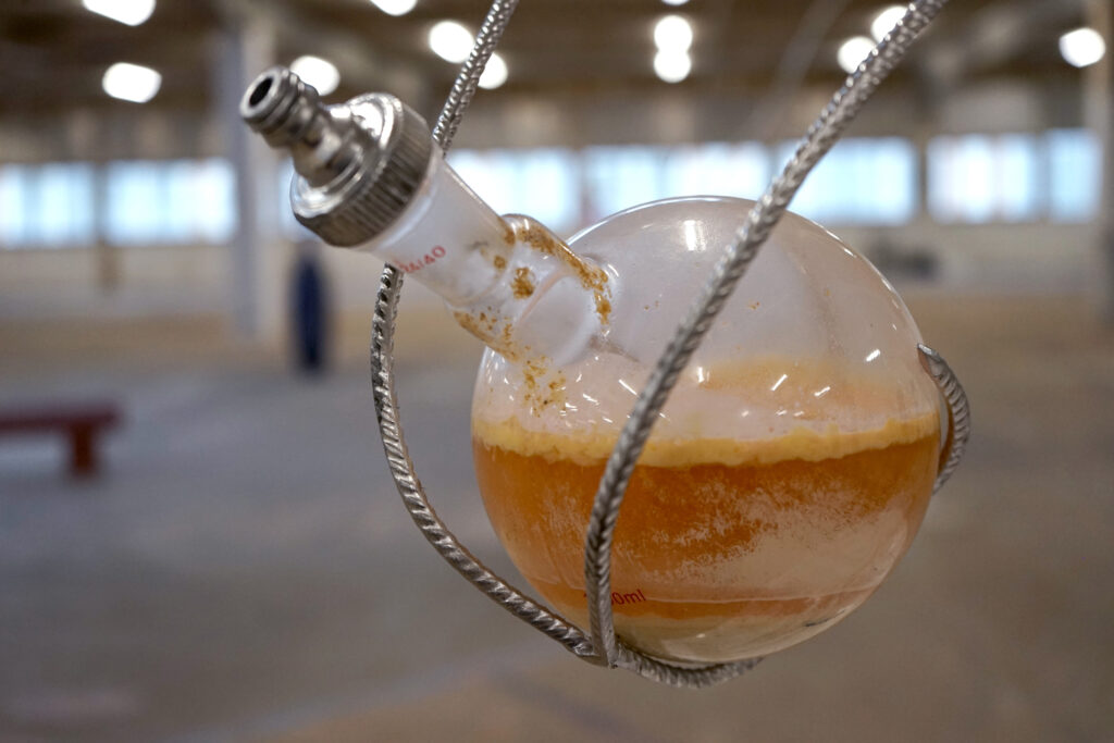 « Anaïs Gauthier’s sculptures depict the body-machine that the industrial system shapes. This flesh is not affiliated with a particular species, a mass of meat, but can just as easily be human, animal or vegetable substance. Anaïs Gauthier’s organic and manufactured elements draw on architecture and design to question the physical relationship between transformation and metamorphosis.Maintenance Soupir is slow on the uptake and heavy on the body. Tentacular, half-flower, half-octopus, the almost living sculpture exudes the scent of sweet perspiration, giving this four-metre-high organism a disconcerting impression: this architectural body suffers from effort, but is stubborn and carries on. The artist leaves us free to interpret what this constant effort might refer to: it could be that of workers mechanically maneuvering cubic meters of perfume concentrate, soaps or essential oils of all kinds; it could be that of perfume plants whose juices are used up; it could be that of the heavy perfume industry, moving fortunes to dress human beings in seductive fragrances. » Sandra Barré